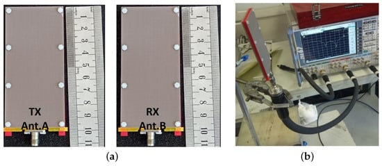 The entire antenna design, including the coaxial feed, is encased in a low-loss polytetrafluoroethylene (PTFE) so that it can be placed in the most realistic environment possible and measurements can be made. An external connection is made using a 1.85 mm flanged launcher and a GB185 glass bead. The antenna layers were fabricated using a typical low-cost PCB fabrication method. The measurement configuration for the multi-layer LWA’s prototype photo is shown in Figure 9, along with two prototypes of the proposed LWA (ant. A and B) for RVSM application.