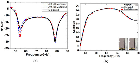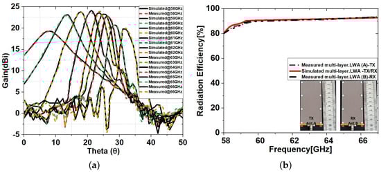 A rotatable base connected to the computer for data acquisition was used to measure the patterns of antenna radiation. The antenna is rotated through 0°, 10°, 20°, 30°, up to 360° and then returned to the starting position after calibrating the VNA to 0 dB insertion loss. The information is then gathered and kept on file to forecast the signal strength. Figure 10 compares the simulated and measured results of the and the gain of the proposed multi-layer LWA for RVSM. The measured values for the bandwidth and the maximum gain of ant. A is 7.89 GHz and 23.95 dBi, respectively, which are slightly higher than the simulation values (6.8 GHz and 23.5 dBi). Over the key frequencies of interest ranging from 58 to 66 GHz, the S-parameter stays lower than −10 dB. In addition, the beam scanning ranges of each of the tested antennas are the same, with a scanning range of . The small discrepancies between simulations and measurements are attributed to errors during the fabrication process, which affect the performance of the antenna at mm-wave frequencies.