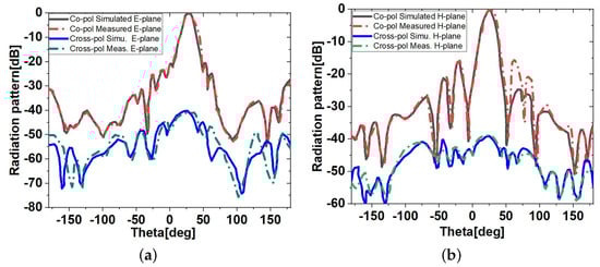 To validate the design concept, the measured far-field radiation patterns of the co-polar and cross-polar in the E-plane and H-plane radiation patterns at 62.5 GHz are presented in Figure 11. Manufacturing and radiation measurement tolerances, such as link losses, lateral reflections, and antenna misalignment, may be to blame for any differences between the simulated and observed and FRPs. A complete comparison between simulated and measured E-plane radiation patterns at different frequencies is given in Figure 12a. They show excellent agreement between simulations and measurements.