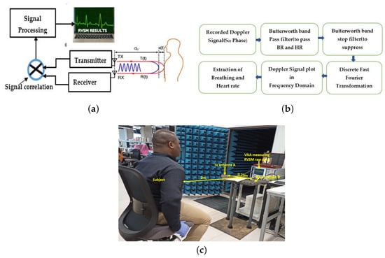 The proposed RVSM process is shown in a block diagram in Figure 13a. The transmitting antenna (Tx ) transmits a one-tone electromagnetic (EM), continuous wave (CW signal) in RVSM using a DR technique for a predetermined period of time. After the electromagnetic signal is scattered on the chest of a person standing at a determined distance in front of the antennas, it is simultaneously picked up by a receiving antenna (Rx). The quasi-periodic oscillations in the chest caused by breathing and heartbeats during the designated time phase modulate the received signal. The received phase-modulated signal and the transmitted signal are correlated for demodulation. The time domain (TD) information for the roughly recorded baseband signal at the Rx is provided below [4]:
