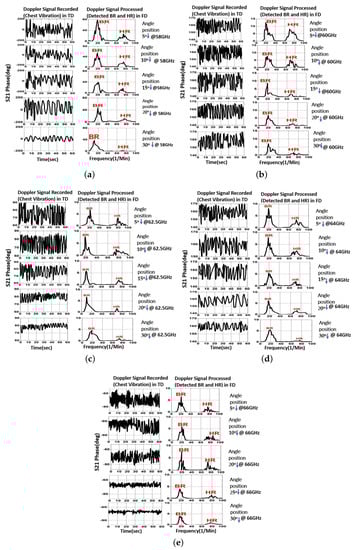 In this experiment, the target is 2 m away from the transmitter and the receiver antennas at , , , , and . For each angular point, the demodulated Doppler signal in TD, which contains the phase data, is recorded at 58 GHz. The results are replicated for frequencies of 60 GHz, 62.5 GHz, 64 GHz, and 66 GHz. As a result, we are able to collect five sets of phase data at the five specified angular locations for 58 GHz, 60 GHz, 62.5 GHz, 64 GHz, and 65 GHz, as shown in Figure 14 and Table 2. On the left of each subplot is the Doppler signal that was recorded in TD, and on the right is the corresponding processed signal in FD. It can be seen that the Doppler signal with the biggest amplitude compared to the level of background noise was picked up at a wider angle when the operating frequencies were higher. A good illustration of this is the modest peak HR, which is more easily detected by noise.