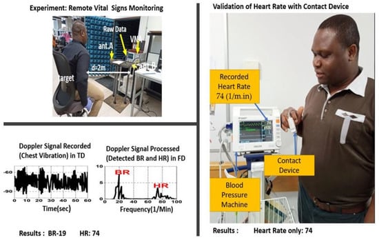 Conventional methods of monitoring vital signs, such as an electrocardiogram (ECG), pulse oximetry, and capnography, require sensors to be attached directly to the patient’s body, which is either uncomfortable for the patient or not possible under certain circumstances [1,2,3,4,5,6,7,8]. Due to the fact that sensors do not require direct contact with the body, remote monitoring of vital signs with a Doppler radar is more convenient than conventional methods [8]. This makes remote monitoring of vital signs with a Doppler radar an attractive option. A Doppler radar is a non-contact technology that can detect small movements of the body caused by the heartbeat and breathing. This technology has the potential to revolutionize healthcare by providing continuous and non-invasive monitoring of vital signs, particularly for patients who require frequent monitoring or who are in critical condition. Remote vital sign monitoring (RVSM) with a Doppler radar has the potential to be used in a variety of disciplines, including general and specialised healthcare, emergency services, security, and defence. However, for RVSM to be useful in practice, further research needs to be conducted on the accuracy and reliability of the results in different settings and populations [1,2,3,4,5,6,7,8,9,10].