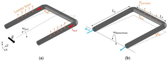 The sensor consists of a free-suspended tube that is fixed on both ends. To generate Lorentz forces and to bring the tube into vibration, an AC actuation current () is applied to the tube in the presence of a magnetic field (). According to the direction of the magnetic field in this design, as shown in Figure 1a, the resulting Lorentz forces are in opposite directions at the left and right sides of the sensor tube. This will induce a twist mode vibration, indicated by the angular velocity and rotation angle . The Lorentz force at each side of the tube can be expressed as: