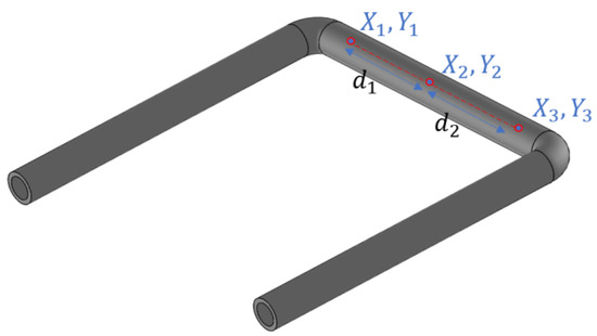 In the device presented in this paper, to measure the motion of the tube in swing mode, a laser Doppler vibrometer is chosen as a readout. Because of the round outer surface of the tube, measuring the displacement in the Coriolis mode is challenging. Furthermore, the actuation axis can slightly shift due to a pressure gradient inside the tube. Therefore, we have chosen to measure the vibration of the tube in three points as indicated in Figure 2. Both the actuation amplitude in (2) and the detection amplitude from (14) are then calculated from the three measured amplitudes.