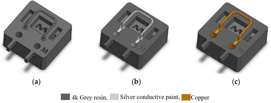 Schematic representation of a top view of the fabrication process. (a) Printing the whole structure, (b) applying silver conductive paint on the tube to provide a conductive track for applying the actuation current, and (c) copper plating on the surface of the tube to reduce the resistance of the conductive track.