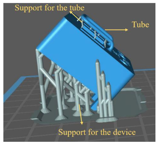 Adjusting the printed device angle to 45 degrees for high-quality printing on the Mini 4K Phrozen printer. Small support structures were added underneath the tube to prevent it from floating inside the resin during printing.
