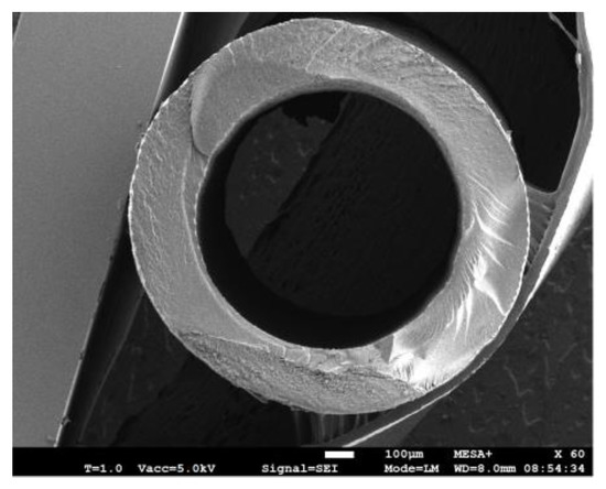 SEM photographs of the tube with a diameter of 900 µm, and a wall thickness of 230 µm. Based on the resolution of the printer that we used, this is the thinnest wall that could be reached for this U-shaped tube. A thinner wall caused leakage and a thicker wall decreased the sensitivity of the sensor due to the increased mass of the tube.