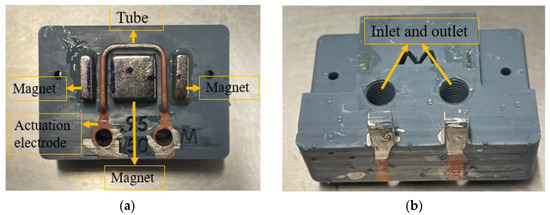 Photographs of the 3D-printed Coriolis mass flow sensor: (a) top view and (b) bottom view.