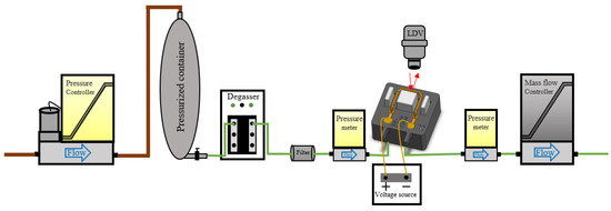A block schematic of the experimental setup for applying liquid flows is shown in Figure 7. In this setup, a pressure controller sets the input pressure of a pressurized container that is filled with liquid, such as water or IPA. To prevent gas bubbles inside the liquid, a degasser is connected to the fluid container. A filter is inserted after the degasser to eliminate particles. Two pressure sensors are connected close to the inlet and outlet of the sensor that is being tested for measuring the pressure drop along the tube. A voltage source is used to apply the actuation signal to generate Lorentz forces. The displacement of the tube in both actuation and detection mode was detected by a laser Doppler vibrometer (LDV), a Polytec MSA-600 microsystem analyzer, as described in Section 2.3. A Bronkhorst mass flow controller is used as the last component in the line to control the mass flow rate. When testing with gases, the pressurized container and degasser are not needed and are removed from the setup. When measuring with liquids, the input pressure was between 4.5 and 5 bar. When measuring with gases, an input pressure of 8 bar was used.
