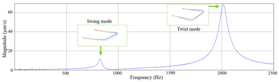 Measured vibration spectrum of air-filled tube detected by LDV. A periodic chirp signal with an amplitude of 30 mV was applied to the tube as an input voltage. The measured resonance frequencies and quality factors are 822 Hz and 27 for the swing mode, and 2015 Hz and 26 for the twist mode, respectively.