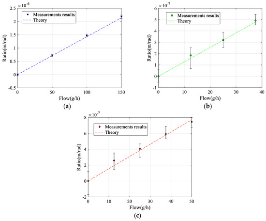 Measured and theoretical ratio between the Coriolis motion and the actuation amplitude according to Equations (29) and (14), respectively, as a function of mass flow of (a) water, (b) IPA, and (c) nitrogen. For all fluids, the same correction factor of 0.6 was applied to the model (14) such that the theoretical response matches the measurement results.