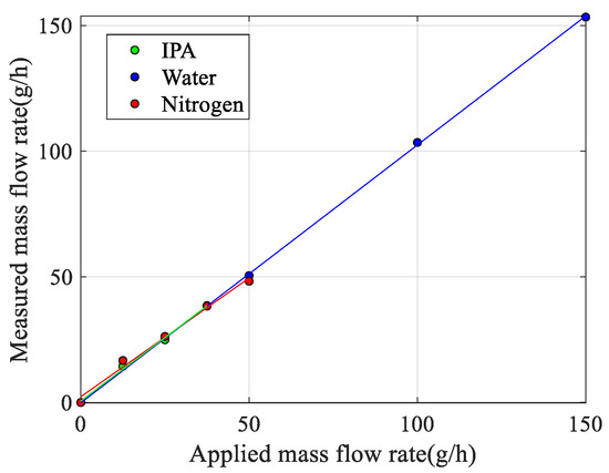 Measured mass flow rate as a function of applied mass flow rate for water, IPA, and nitrogen, using the theoretical response (14) to convert the measured response into the corresponding mass flow.