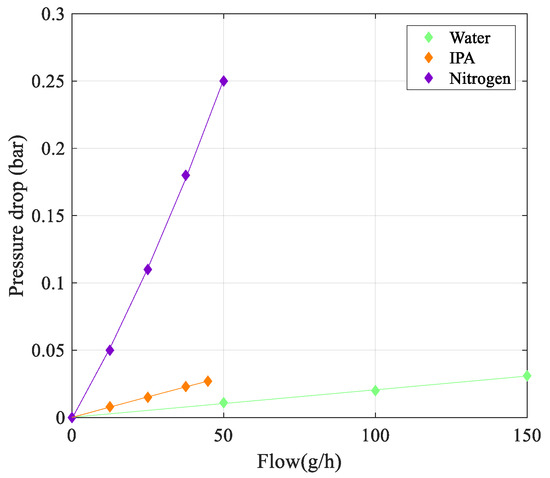The pressure drop over the tube vs. flow rate is shown in Figure 11. An estimation of the pressure drop based on the Hagen–Poiseuille equation shows that the maximum pressure drop for water and IPA should be 1.1 mbar and 0.8 mbar, respectively [17]. The pressure drop for nitrogen is expected to be around 5 mbar, mainly due to the two 90-degree bends in the tube. As is clear from Figure 11, the measured pressure drop is significantly higher because of the extra pressure drop in the relatively long connecting tubing between the sensor and the two pressure sensors.