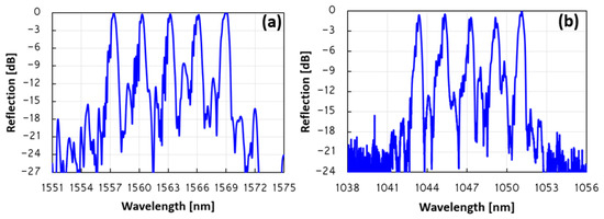 The reflection spectra of this FBG array can be seen in Figure 4a. The reflection peak of all five FBGs is quite similar and very close to 0 dB, while all five peaks are approximately 25 dB above the background. The measured bandwidth at −3 dB (FWHM) of each FBG in the array is ~0.55 nm, apart from the first inscribed FBG, which has a bandwidth of ~0.7 nm (the 1569 nm FBG). The measured insertion loss for the FBG array is approximately −0.5 dB. In addition, the third-order Bragg wavelength is also measured. The reflection spectra of the array of all five FBGs are clearly visible in Figure 4b. All five peaks are ~20 dB above the background. The reflection peaks are in the following wavelengths: 1051.12 nm, 1049.14 nm, 1047.16 nm, 1045.33 nm, and 1043.38 nm. This indicates a wavelength separation of ~1.9 nm between each two consecutive FBGs, in contrast to a wavelength separation of ~2.9 nm of the second-order FBG array. The total wavelength separation of the array between the first FBG and the last one is 7.74 nm.
