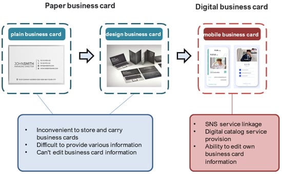 Figure 3 illustrates the differences and progression between paper and digital business cards. Some users find registration and management functions of mobile business card software challenging and continue to rely on offline business cards (paper business cards). Print volumes continue to grow, reflecting this trend. Offline business cards, being true to their purpose, hold an advantage in ease of use compared to digital business cards. However, the integration of technology and design has sparked interest in AR business card systems based on digital media.