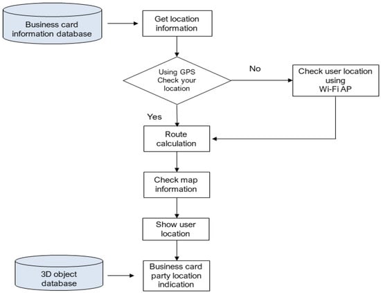 As illustrated in Figure 6, the location information provision service employed in this research utilizes the address information from the business card holder’s data stored in the business card information database. This is carried out sequentially by the location information provision service module. The process involves obtaining location information and using the GPS stored on the smartphone to determine the user’s location.