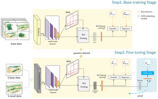 Figure 2 shows the overall architecture of our model. A two-stage detection model, Faster R-CNN, is used as the base detector. Backbone network and FPN receive the input images and output feature maps as a proportionally sized feature maps at multiple levels, in a fully convolutional fashion. The Region proposal network (RPN) proposes candidate boxes from the feature map. RoI pooling extracts the proposed region corresponding to the anchor frame and unifies it into a fix-sized feature vector. The produced region proposal , where is the m-dimension RoI feature vector, will be calculate in the R-CNN predictor head. Then, RoI head output box offsets and class confidences. In fine-tuning stage, the amount of data is far less than base-training stage, so the overfitting problem will be very severe. To avoid the overfitting, we freeze the parameters of the backbone network and fine-tune the remaining parameters. The derivable SVM embedding module participate in the few-shot fine-tuning training. This embedding layer adds SVM multiclassification task as a constraint on the fine-tuning training phase. The additional supervised information will enrich the representation of the embedding space. Details about the SVM module are described in Section 3.3.