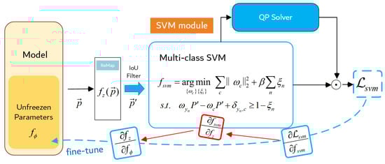 The SVM module we have designed is shown in Figure 3. The region features are remapped with , before being transported to the SVM module. The projected features will pass through an IoU filter. It will filter out a portion of the proposed regions under an IoU threshold. Experimentally, setting the IoU threshold can effectively control the quality of the features that input to the SVM layer, resulting in a better performance of the model. The above filtered features will input into the SVM module. Inspired by the literature [27], the multi-classification SVM solution algorithm [31] is placed into our proposed SVM module. The objective function of the multiclassification SVM algorithm is:
