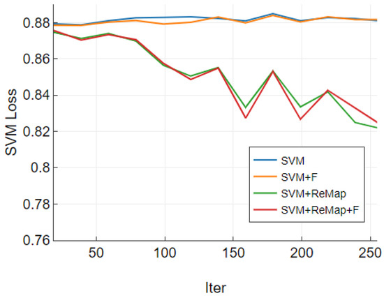 We found that adding a remapping layer can effectively reduce the SVM loss generated by our additional multi-classification task shown as Figure 4. During the first 250 iters of the fine-tuning stage, the remapping layer was able to bring down the SVM loss, while the SVM loss without the remapping layer always oscillated above and below the initial value. Since the parameter space of the remapping layer is smaller than that of the overall model, we analyze that the remapping layer can act as a gradient amplifier by adjusting the effect of SVM layer to amplify a meaningful and expressive SVM losses.