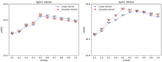 In this paper, we use two most common kernel functions for testing, namely linear kernel functions and gaussian kernel functions. The linear kernel is usually applied when the original feature vector is already relatively linearly separable, while the gaussian kernel can construct nonlinearly separable decision intervals by mapping the original feature vector to a gaussian kernel space. We test the impact of these two kernel functions on the model, shown in Table 6. The performance of the two kernel functions is measured by changing the regularization parameter and the balance factor of SVM loss . The regularization parameter can regulate the solution of the multi-classification SVM task in Equation (1), and a smaller leads to simpler constitutive decision space. It can also reduce the overfitting in the data-hunger setting. We tested two values of , 0.1 and 0.5, respectively. Table 6 shows that a larger leads to a higher performance, is more suitable for the current sampled sample points. However, fine-tuning the balance fator produces a slight perturbation of the model parameters and no significant enhancement effect. So we further test the value of while setting to 0.5 in two kernel-type scenarios. Figure 5 shows the experiment results in both 10-shot and 30-shot settings. Results show that the model achieves the best results in the 10-shot and 30-shot scenarios when lambda is equal to 0.5. For the gaussian kernel-based FSVM, nAP50 will decline when lambda is greater than 0.5. For the linear kernel-based FSVM, nAP50 will decline when lambda is greater than 0.8. Finally, we determined to maintain model stability.