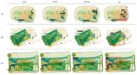Figure 7 compares the results of our FSVM method to two transfer-based few-shot methods, TFA and FSCE.We show the visualization results for three different scenarios: (a) clear background with no shading or overlap; (b) laptop-obscured; and (c) complicated background with items obscured and cluttered. As shown in the picture, although the predicted bounding box is not accurate enough, our model detects contraband in all three scenarios and all targets in scenario c).