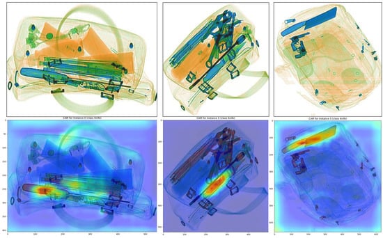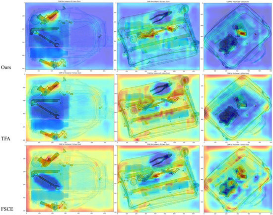 We also use Gradcam [38] to visualize the region of interest for the model when making classification decisions. Figure 8 shows the Gradcam heatmap results for the knife class. The upper part of the figure represents original X-ray baggage samples in the dataset. We can see that our model mostly recognizes a knife by its handle when the items are occluded by other metal structures. The activated regions (the red part of the picture) on samples are compact and concentrated, which shows our model learned the correct representation message through SVM-module finetuning. To further compare the Gradcam results, we also visualized the heatmap results of TFA and FSCE as shown in Figure 9. In this figure, we focus on gun class, and we can see that both TFA and FSCE focus not only on the prohibited items but also more on the complex background. The result shows that our model mitigates the negative impact of contraband that is difficult to distinguish in complex background distributions to some extent, which reflects the high learning ability of the model.