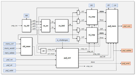Block diagram of the proposed RO-PUF/TRNG design (blue and red boxes represent inputs and outputs, respectively).