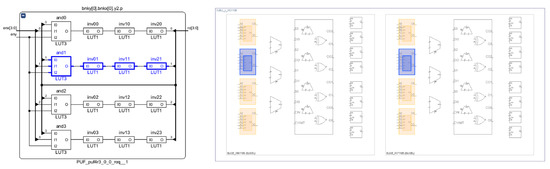 A matrix of CLBs with columns and rows, each of which implements four 4-stage ROs, constitutes the main block of the RO-PUF. Each RO is described with three stages of NOT logic gates, the fourth stage being a NAND gate that serves the dual purposes of receiving column and row enable inputs and closing the feedback loop of the RO, as shown in the diagram on the left side of Figure 2. Each of the eight LUTs in the Xilinx Series-7 and Zynq-7000 CLBs can implement two separate Boolean functions with no more than five inputs [44]. Consequently, it is possible to locate the four ROs within a single CLB and fully utilize the logical resources of the programmable device by employing the proper placement directives in the HDL description.