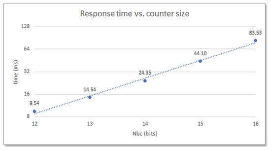 The specifications of the programmable device, such as family, part, and speed grade, with which the module is implemented (which determine the oscillation frequency of the ROs), as well as the parameters used when implementing the design, mainly those that define the size of the RO bank and the length of the counters (which determine the number of comparisons to be performed) have a major impact on how fast the system operates. This behavior is shown in Figure 5, which illustrates how the response times of a 480-RO PUF implemented in the Zynq-7000 device of a Pynq Z2 board change when the size of the counters moves in the range 12- to 16-bits. With an average oscillation frequency of the ROs on this device around 315 MHz, the PUF takes almost 25 ms to produce its output when implementing 14-bit counters, but only slightly more than half of this time when the size of the counter is decreased to 13-bits.