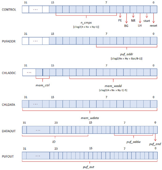 The PUF/TRNG receives the initialization () and operation start () signals, as well as the number of challenges () and configuration choices (PE, BG, LH, and NR) through the CONTROL input register. With the exception of the first field, which is dependent on the RO bank size established when implementing the PUF/TRNG, all fields have constant lengths. After the module has completed its operation, PUFADDR is utilized as an input register to access PUF memory. As the design is synthesized, the maximum number of bits to represent the read memory addresses () is appropriately calculated as a function of the length of the PUF response and the number of memory cells required to store it. The other two input registers are used to store the challenge selection mask for the PUF. CHLADDC provides control and address signals to determine the write or read of the internal memory, as well as to select the address of the cell accessed in the operation. The maximum number of bits to represent the write-memory address () is automatically adjusted as a function of the PUF size. Finally, the content of the challenge selection mask is provided through the field in the CHLDATA register, whose size coincides with the register length chosen when synthesizing the system.