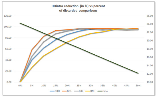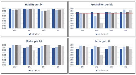 In order to double the bit generation rate in the PUF response, our proposal takes advantage of the two distinct behaviors identified in [27] to perform two comparisons in parallel. In one of them, the comparison is made between two ROs implemented in LUTs placed in the same position of different configurable logic blocks (CLBs), while in the other it is carried out between ROs implemented in LUTs placed in different positions within the same or a different CLB. Furthermore, to improve the reliability of the PUF output, a selection mask created during a prior enrollment process and saved in the challenge mask memory block () can be used to choose the pairs of ROs that will participate in the comparisons during normal PUF operation. The challenge generation () and enable () blocks give, respectively, the selection and enable signals for the two pairs of ROs to be compared in each comparison cycle. On the other hand, the PUF output block () receives its information from the two comparison blocks (). For each of the two mentioned comparisons, this block selects the best bits depending on the functionality requested to the module: ID generator or entropy source. In the first case, the sign bit plus a bit of the slower RO counter that offers adequate values of stability (S), probability (P), and entropy (Hintra and Hinter) are taken from one of the comparisons, while two bits of the slower counter satisfying the same requirements are taken from the other one. The bits that present the highest entropy values and probability values closer to 50% are, on the other hand, the most appropriate when the system acts as TRNG. The meaning and calculation of these metrics are detailed in Section 4.