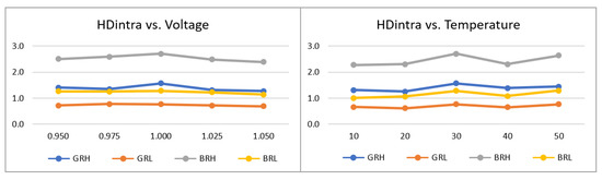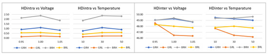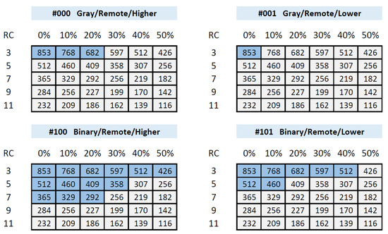 The specific bits that will contribute to the output depend on the operation specified for the module using the PE (PUF/Entropy Source) run-time configuration option. The bits selected for the PUF operation are determined by the type of ROs being compared as well as by the LH (Lower/Higher) option defined by the user. As in other works in the literature [25,26,27], to make them independent of the size of the counters, in the text, the sign bit is denoted as bit 0 and the rest of the bits are named in ascending order, bit 1 being the MSB of the counter value. According to this notation, bit 6 and 7 (for the Lower option) or bits 7 and 8 (for the Higher option), both from the slower counter, are chosen to form a part of the PUF output for comparisons between ROs implemented in LUTs placed in different locations of the CLBs. The sign bit in association with bit 7 (Lower option) or bit 8 (Higher option) of the slower counter contribute to the output of the PUF in comparisons between ROs implemented in LUTs placed in the same location of different CLBs.