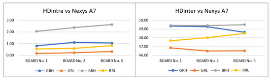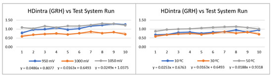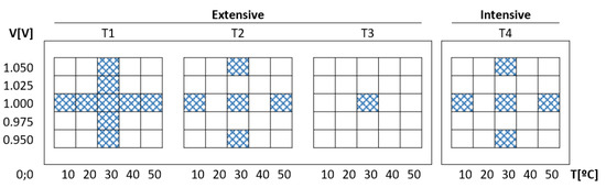 On the other hand, to build the experimental setup used to analyze the behavior of the module under changes in operating conditions (temperature and supply voltage), a second set of test systems was implemented on the Artix-7 FPGA of the Nexys A7 development board using a 32-bit MicroBlaze processor to run verification and test programs in a standalone environment. As shown on the right side of Figure 8, the resources available in this device allowed it to accommodate six copies of the IP module with 480 ROs and 14-bit counters. In both cases, orange cells correspond to the RO banks whose positions were fixed when the PUFs were instantiated, white boxes mark the zones defined by the ‘pblock’ directives to place the components of the MicroBlaze processing system, and the cells in green show fully or partially used device resources.