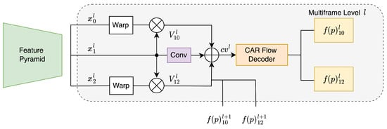 Flow estimation networks commonly use an encoder–decoder structure. We use a PWC-Net variant (unsupervised) as the backbone [27,39]. The optical flow is estimated in a coarse-to-fine manner. The network contains a shared-weight Siamese feature pyramid which extracts feature maps at different scales from images. At level l, the feature map of the second image is warped by the predicted flow of the (previous) coarser level. Then, the cost volume is calculated using correlation, which represents the matching costs of pixels between images. The decoder module with shared weights at all levels takes the feature map of , the upsampled flow , and the cost volume as inputs and predicts the optical flow of level l. Finally, the upsampled optical flow is input to the next finer level. Figure 1 shows the architecture of our method. We use PWC-Lite [27,39] as a backbone, with some modifications.