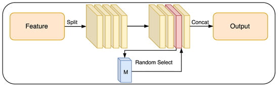 The main idea of our method is to use only one network, but to use it twice, once as the teacher network with the CAR module and once without the CAR module as the student network in our shared-weight teacher–student strategy. Only the teacher network uses our CAR module, which we introduce next. Given a feature map, , where . W and H refer to the width and height of the feature map, respectively, and D indicates the depth of the feature map. We first split e into k subsets by its depth dimension, where is the i-th subset of the feature map. Then, we select a subset j randomly and compute the new feature map via:
