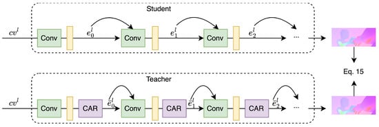 During training, the shared-weight teacher–student strategy forwards data through the network twice, with and without invoking the CAR module. Then, we obtain two different predicted flows, (with CAR module) and (without CAR module). As shown in Figure 4, the flow decoders with and without the CAR module share the same layers, except for the CAR module, which is turned on and off. Therefore, is different from . We regularize the predicted flow by minimizing the difference of two forward passes, i.e.,