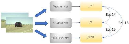 The overall regularization loss is a combination of the above three loss functions in Equations (14)–(16). Thus, our shared-weight teacher–student framework will have multiple forward passes in one training step (see Figure 6). The overall loss is