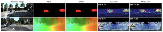 - Stone, A.; Maurer, D.; Ayvaci, A.; Angelova, A.; Jonschkowski, R. SMURF: Self-Teaching Multi-Frame Unsupervised RAFT with Full-Image Warping. In Proceedings of the IEEE/CVF Conference on Computer Vision and Pattern Recognition (CVPR), Nashville, TN, USA, 20–25 June 2021; pp. 3887–3896. [Google Scholar] [CrossRef]
