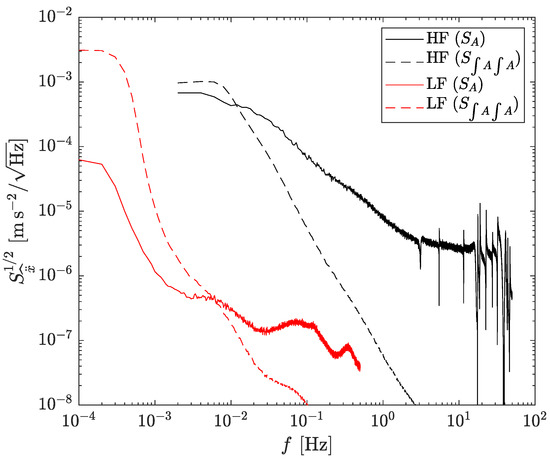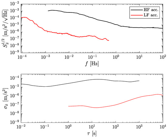 Measured accelerometers’ noise levels. Top: square root of the PSD. Bottom: overlapping Allan deviation. HF: high-frequency accelerometer (black). LF: low-frequency accelerometer (red). The curve for the HF accelerometer represents its actual noise. The curve for the LF accelerometer includes signal and noise and thus indicates a conservative upper limit of its actual noise curve.