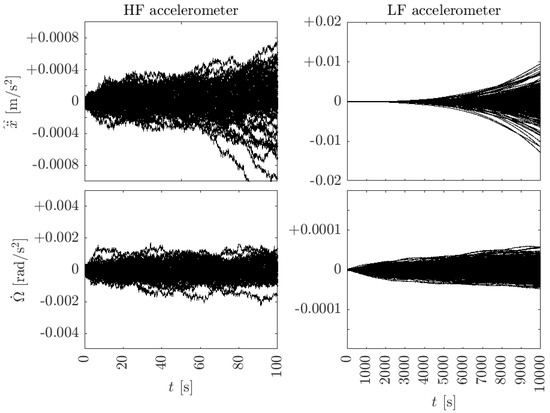 Results in the time domain are shown in Figure 5 for the linear and angular accelerations and for both accelerometers. For this simulation, no external forces or torques were applied. Thus, for noiseless accelerometers, the outputs should be zero. In both cases, 1000 independent realizations were carried out. The left side shows the results of the HF accelerometer. Linear and angular accelerations are shown in the top and bottom figures, respectively. Angular acceleration remains stationary, as expected from Equation (6). On the contrary, linear acceleration diverges slowly after ∼50 s. The reason, as described in Section 3.1, is due to the presence of angular velocity noise coupling into the linear acceleration calculation. The plots on the right show the low-frequency accelerometer case. Clearly, linear acceleration is strongly corrupted by the angular velocity noise for s. The error in the angular acceleration remains bounded, similarly to the HF case.