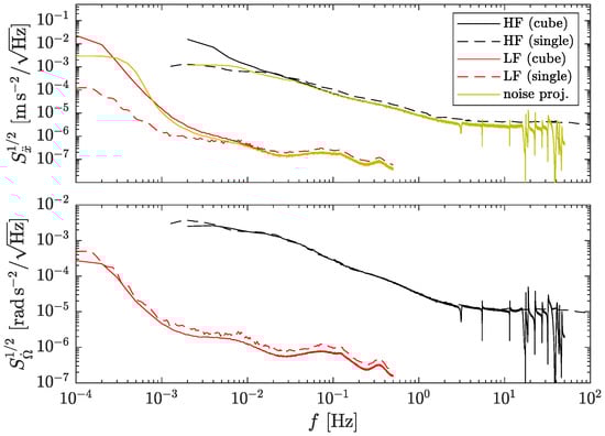 where is the acceleration noise of a single accelerometer in m s. Equation (18) indicates that the accelerometer’s noise at very low frequencies is upconverted to mHz and scaled by the amplitude of the angular velocity . Similarly, the noise in the y and z axes can be calculated, which leads to the sharps peaks observed in Figure 10 at 10 and 20 mHz for y, and 10 mHz for z, respectively. For arbitrary angular velocities, the effect is calculated by convoluting the PSDs of the signals and the noise, as shown in Section 3.1.