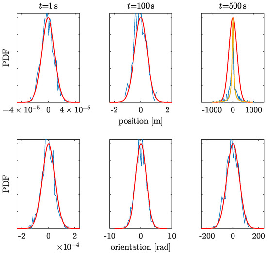High−frequency accelerometer position (top) and orientation (bottom) uncertainties for different times. Results are shown as probability density functions (PDF) calculated from 1000 simulations. Blue: simulation results. Red: Gaussian distribution fit. Ocher: Cauchy distribution fit.