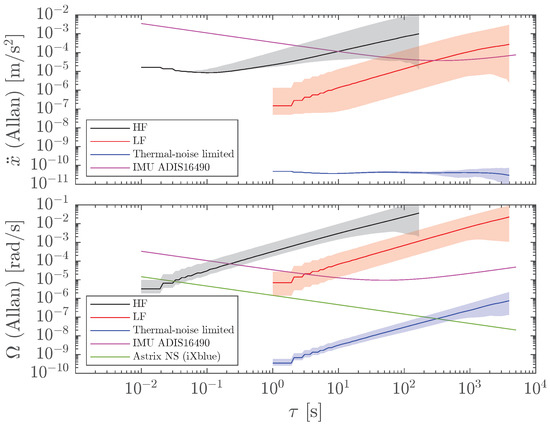 The benefits of GF-INSs pointed out in Section 1 are useless unless the performance is similar to traditional INSs. In this section, we compare our results to a tactical-grade MEMS-based inertial sensor (ADIS16490 from Analog Devices), and to an optical gyroscope for space applications (Astrix NS from iXblue). These devices report their performance in terms of the Allan deviation; thus, we perform the comparison in such a metric. An obvious advantage of gyroscopes is that they directly measure angular velocity, and, consequently, conversion to orientation requires only one integration step, as opposed to GF-INS, where two integration stages are needed. Figure 11 shows the Allan deviations of the linear accelerations (top) and the angular velocities (bottom) of the HF (black) and LF (red) GF-INSs. The magenta and green traces correspond to the MEMS inertial sensors and optical gyroscopes, respectively. In terms of linear acceleration, the HF GF-INS outperforms the MEMS only from a few 10 ms to a few seconds. The LF GF-INS performance is better than the MEMS up to hundreds of seconds. The situation is different when considering angular velocity. Here, the MEMS inertial sensor and the optical gyroscope are better options than HF and LF GF-INSs. Thus, for the current sensitivity levels of our opto-mechanical accelerometers, GF-INSs have severe limitations, especially for orientation estimation.