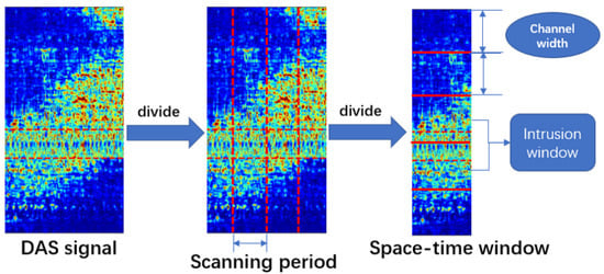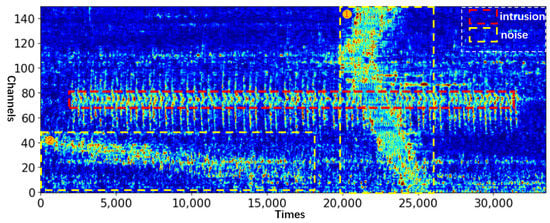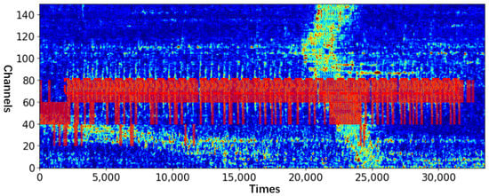 Figure 1 was used to collect vibration signals, in which the DAS spatial resolution was set to 10 m (i.e., the space interval between two channels), and the signal sampling rate was 488 Hz. The DAS system was deployed at a high-speed railway station, and the optical fiber was fixed along the barrier beside the tracks for approximately 40 km.