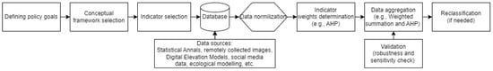 The general steps for conducting a regional ecosystem condition assessment are defining policy goals, selecting indicators based on a conceptual framework, selecting suitable weighting and aggregation techniques, and checking for robustness and sensitivity (Figure 1). The results may be reclassified to facilitate communications. The assessment is generally completed in a GIS setting. Indicating variables (or indicators) (e.g., land use and Normalized Difference Vegetation Index/NDVI) and MCAs are commonly adopted to reflect regional ecosystem conditions. Although they have been criticized for not including interactions among variables [1], the relative simplicity of the indicators is useful to communicate complex ideas for policy making or for public awareness [28,29].