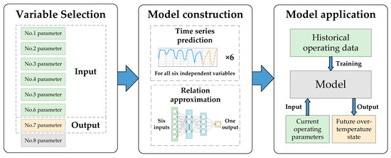 The prediction of a valve’s cooling water temperature is essentially a combination of time-series prediction and function approximation, and the main stages of model construction are as follows: Firstly, the influencing factors of a valve’s cooling water temperature are identified as the independent parameters; secondly, a time-series prediction model is established to forecast future values of the independent variables; thirdly, the relation between the valve’s cooling water temperature and the independent variables is approximated by using the historical operating data of the converter valve; finally, the two models established in the second and third stages are combined to form the complete model. The model is trained with historical operating data so that it can be used to predict the future values of the valve’s cooling water temperature. A flowchart of the overall scheme is shown in Figure 1.