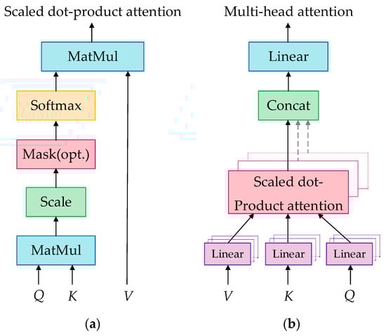 The multi-head attention model [20] is an improvement of the scaled dot-product attention model, as shown in Figure 3b. In this model, , and are mapped through the projection matrices, after which they are used to perform the attention calculation. Then, there are repetitive processes, whose results are finally concatenated, as shown in Equation (9):