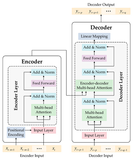 The encoder–decoder architecture is based on the attention mechanism, and it was originally used in the field of NLP. The Transformer is a more novel model based on the encoder–decoder architecture, and it has great application prospects in the domain of time-series prediction. In this section, the attention mechanism, the modified Transformer model, and the process of time-series prediction by the Transformer model will be introduced.