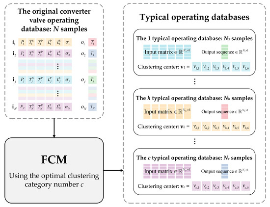 By using the optimal that was obtained, N samples of historical operating data can be clustered into categories corresponding to typical databases, each of which contains samples consisting of six independent variables and one dependent variable from Table 1. The typical database belongs to the typical operating condition, which is mathematically characterized by the clustering center vector . The data vectors in a typical operating database have the highest similarity with each other and the greatest distinction from those in other typical operating databases. A diagram of the construction of a typical database is shown in Figure 7.