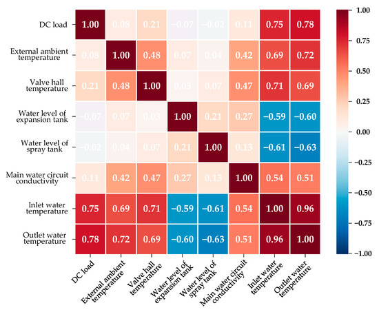 In Section 2, we introduced eight operating parameters that are generally recorded by the operation and maintenance personnel of converter stations, i.e., the DC load, external ambient temperature, valve hall temperature, water level of the expansion tank, water level of the spray tank, main water circuit conductivity, valve inlet water temperature, and valve outlet water temperature. However, there can be some correlations between one parameter and another. If there are parameters that are highly correlated, the complexity of the model will be pointlessly magnified, and the training speed of the model will, thus, be reduced. Therefore, we used the Pearson correlation coefficient [27] to perform a correlation analysis of the operating parameters, and the parameters with high correlation coefficients with others were eliminated.